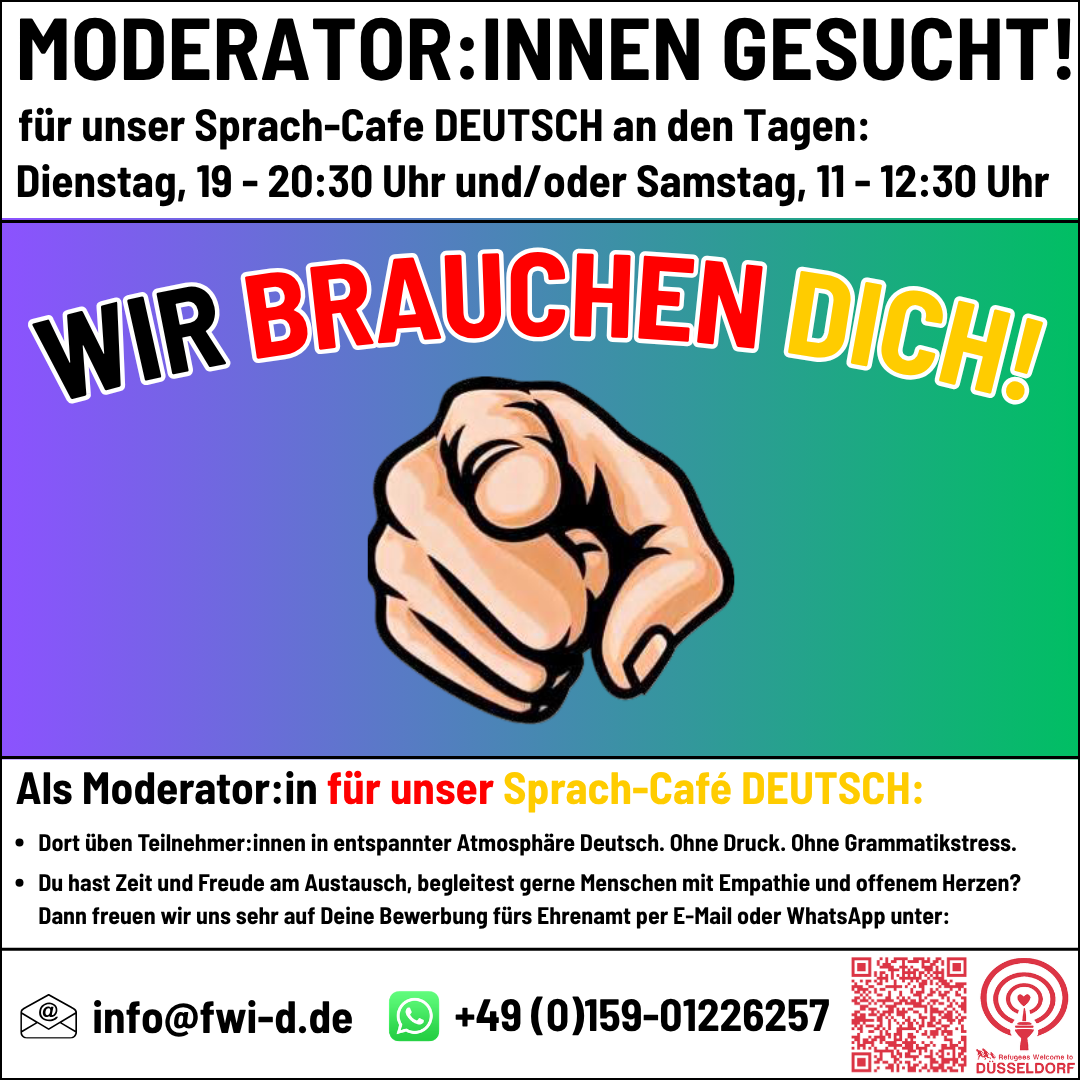 Wenn Du in unserem Sprachcafé-Team als Moderator:in mitmachen möchtest, schreibe uns einfach eine kurze E-Mail oder gib uns eine Nachricht per Whatsapp: