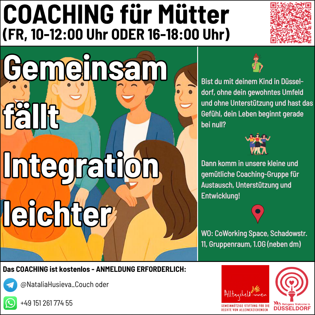 Wir bieten Gruppen-Coaching für ukrainische Mütter in Düsseldorf an, die sich beruflich verwirklichen und selbstbewusst auf eigenen Beinen stehen möchten. Du kannst die Kurse morgens oder nachmittags besuchen.