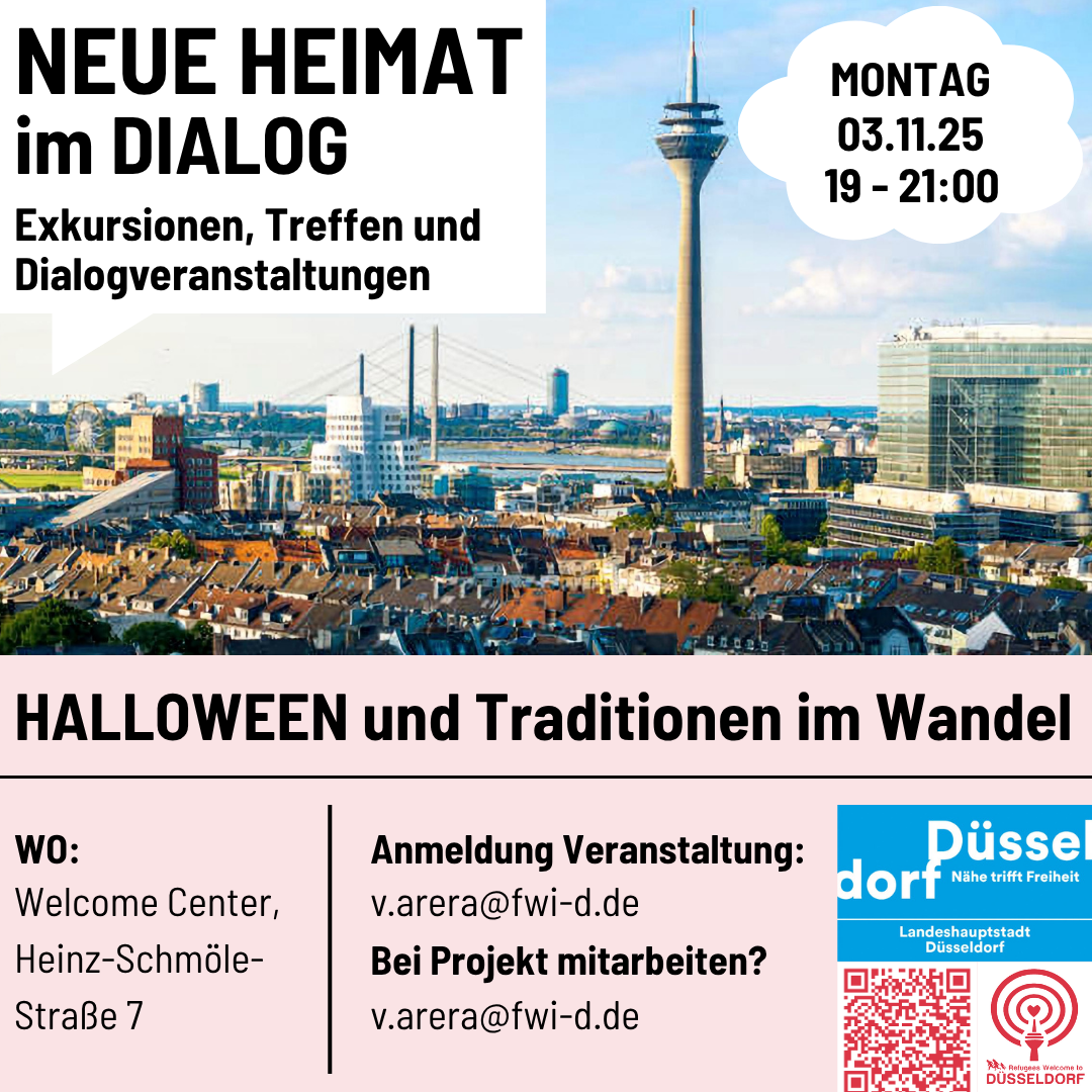 Am MO, 03.11.25, 19 - 21:00 Uhr starten wir unsere Veranstaltungsreihe "Neue Heimat im Dialog" - mit Exkursionen, Treffen und Dialogveranstaltungen. Wir beginnen mit der Veranstaltung "Halloween und Traditionen im Wandel" im Welcome Center. Bitte meldet Euch rechtzeitig bei Veronika Arera per E-Mail an.