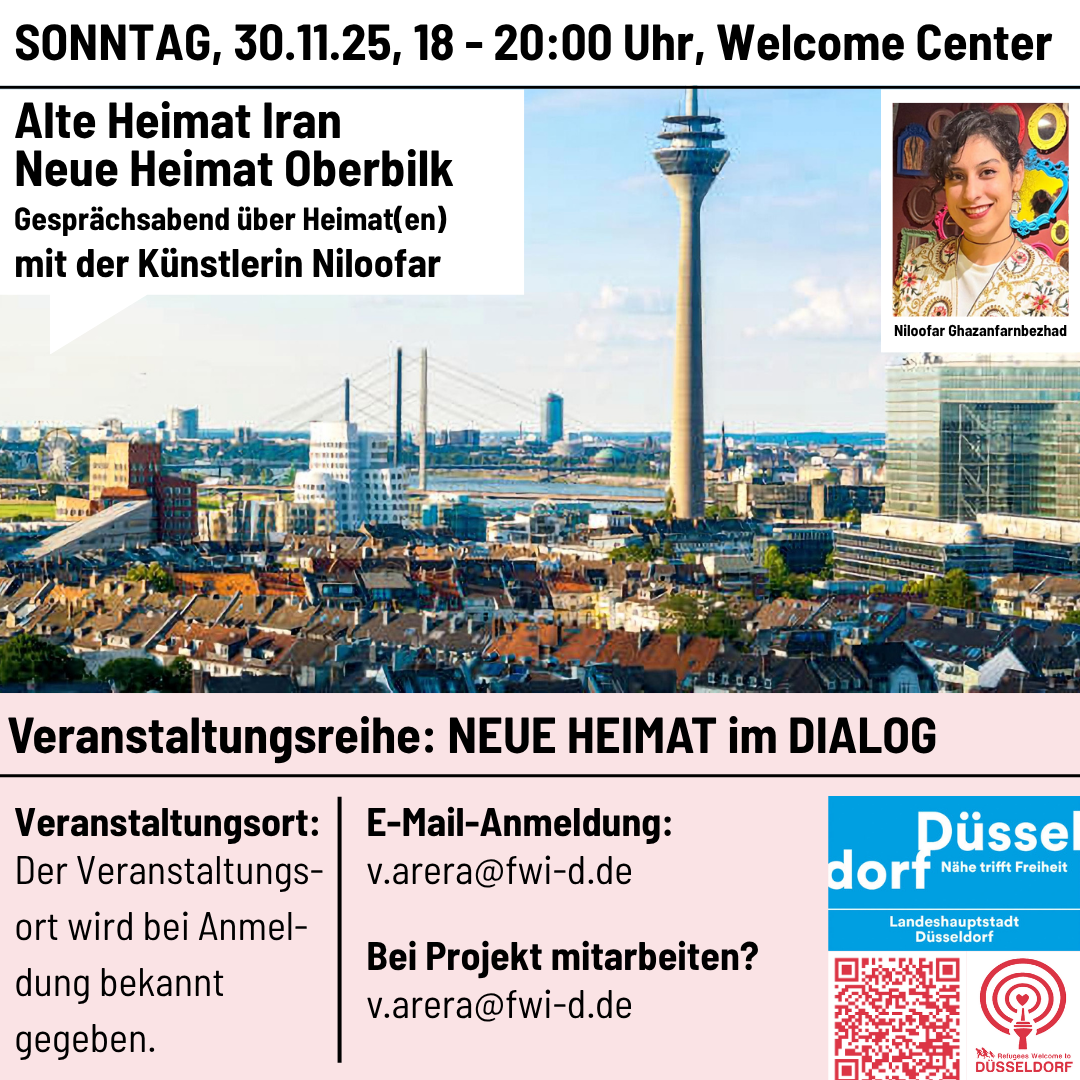 Am SO, 30.11.25, treffen wir uns zwischen 18 - 20:00 Uhr mit der iranischen Künstlerin Niloofar zum Gesprächsabend "Alte Heimat Iran - neu Heimat Oberbilk". Wir diskutieren über unterschiedliche Heimat(en). Der genaue Ort wird Euch bei der Anmeldung bekannt gegeben. Bitte meldet Euch bei Veronika Arera per E-Mail an.