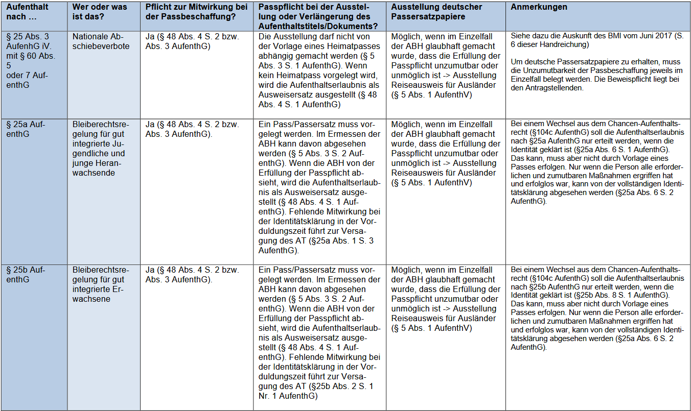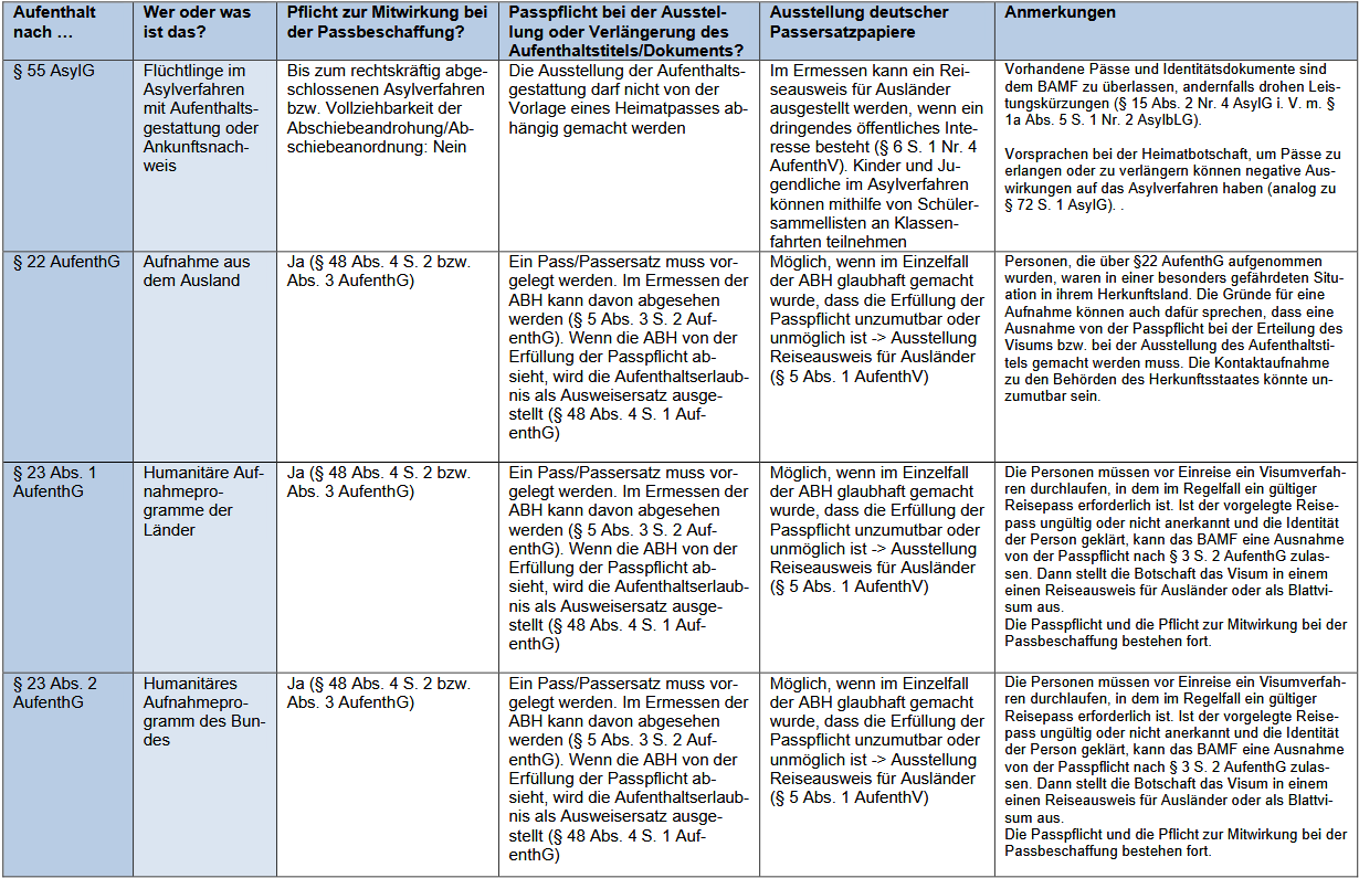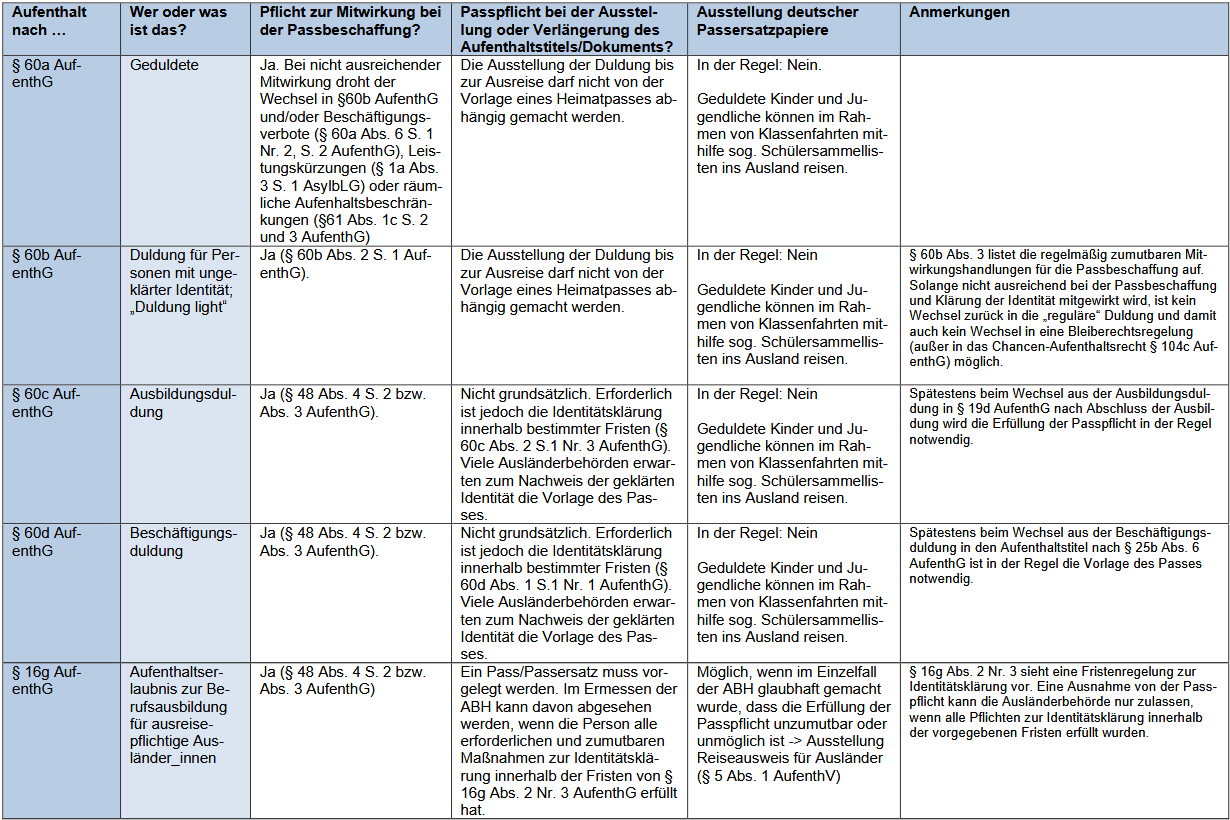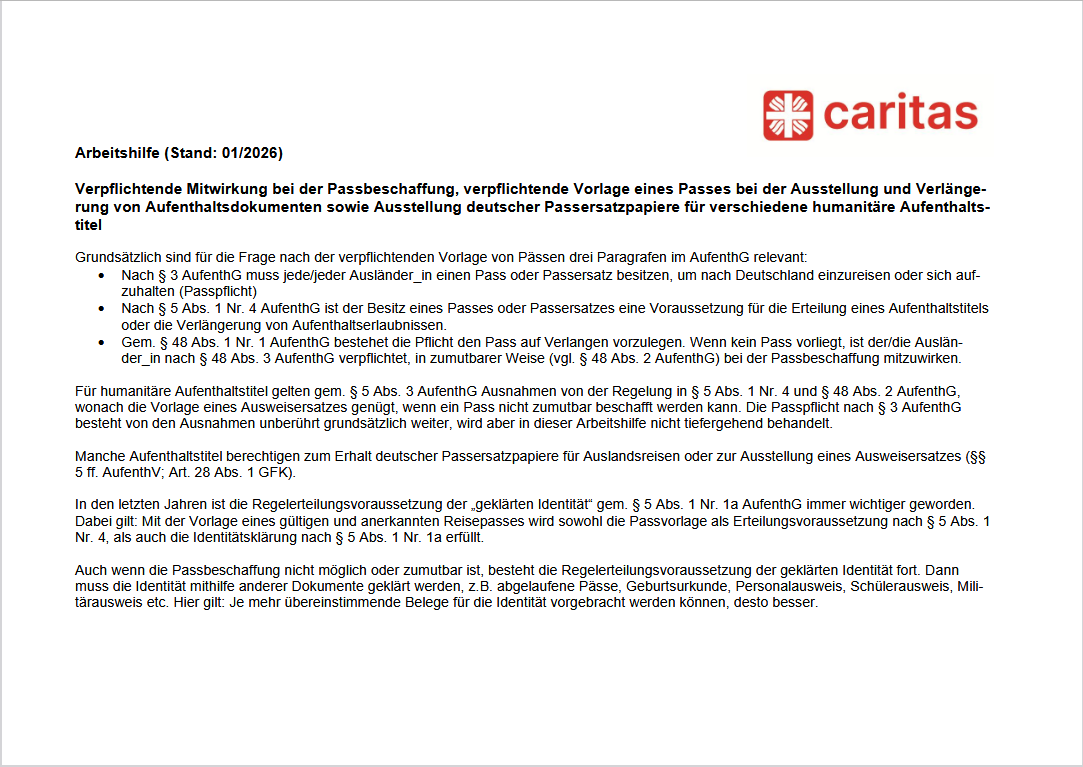 Die Caritas hat im Januar 2026 eine Arbeitshilfe zur Passbeschaffung veröffentlicht. Auf vier Tabellen mit allen Aufenthaltsarten könnt Ihr ablesen*, welche Pflichten wann für welchen Aufenthaltsstatus greifen.