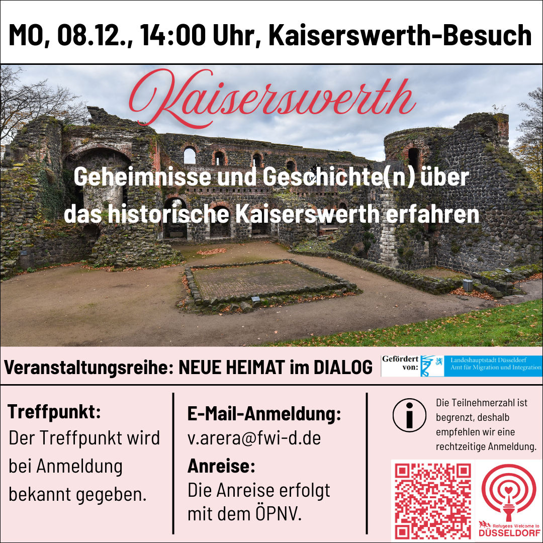 Am 08.12.25 besuchen wir Kaiserswerth, den ältesten Stadtteil Düsseldorfs. Das historische Kaiserswerth wird bereits im 8. Jahrhundert urkundlich erwähnt. Das ist Düsseldorf erst Jahrhunderte später gelungen. Bei unserem Besuch erfahrt Ihr Geheimnisse und weitere Geschichte(n) rund um das historische Kaiserswerth. Bitte rechtzeitig anmelden. Die Teilnehmer:innenzahl ist begrenzt. Den Treffpunkt erfahrt Ihr, wenn Ihr Euch bei Veronika anmeldet.