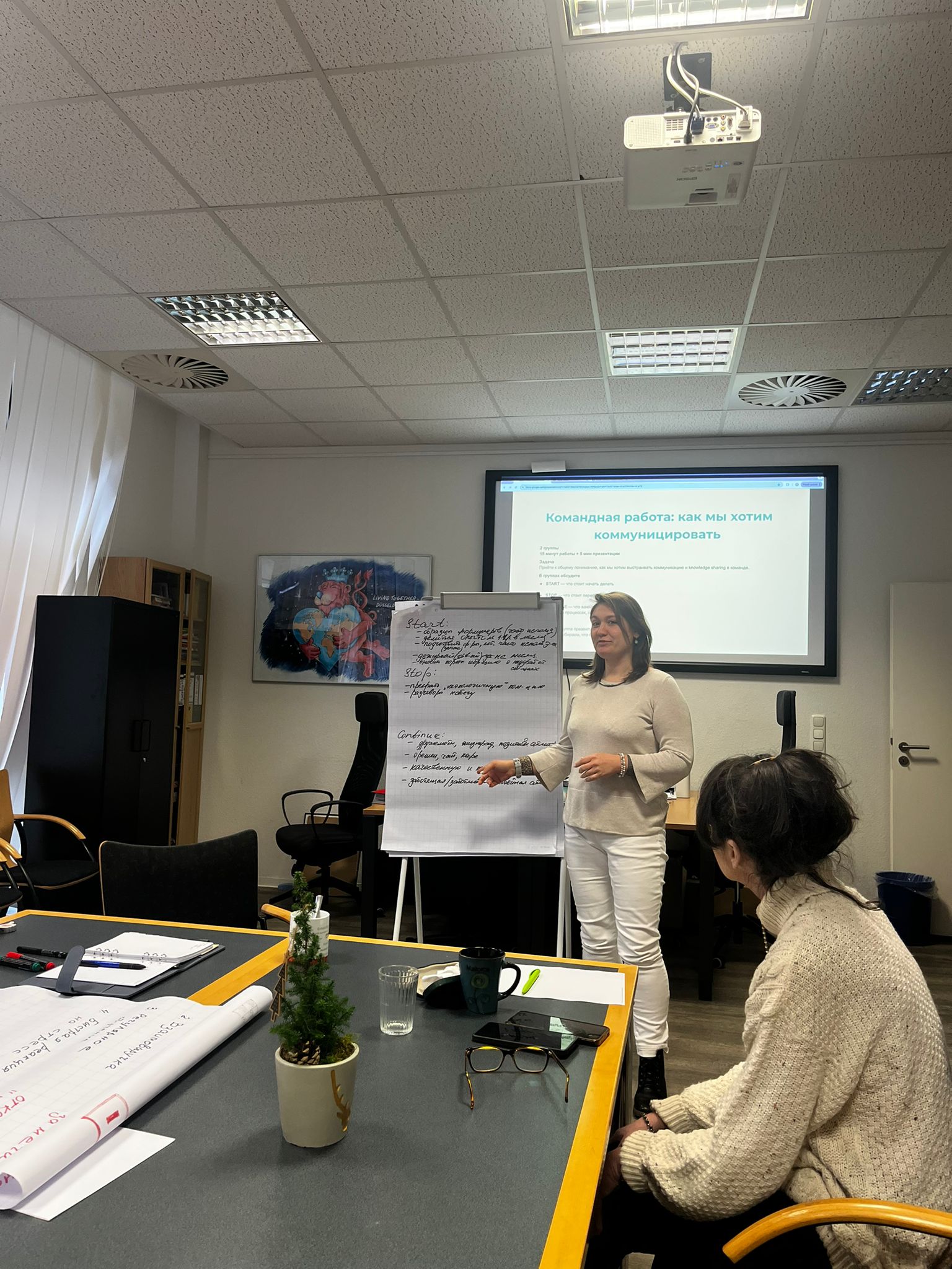 Heute fand der erste interne Workshop zum Thema „Effektive Kommunikation und Teamarbeit in der sozialen Unterstützung von Geflüchteten“ für unsere Ehrenamtsgruppe Ukraine unter der Leitung von Anna Novykova statt. Wir haben uns intensiv mit Zusammenarbeit und Austausch im Arbeitsalltag beschäftigt und uns dabei in kleine Arbeitsgruppen aufgeteilt. Die einzelnen Arbeitsergebnisse wurden hinterher besprochen, ausgewertet und zusammengeführt. Zum Abschluss haben wir unsere Teamleistung und die kommende Weihnachtszeit gefeiert.